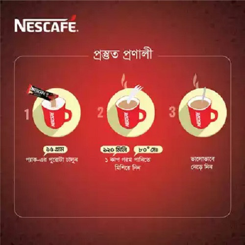120 মিলি গরম (80 ডিগ্রি সেলসিয়াস) জলে 15 গ্রাম স্যাচেট থেকে কফির মিশ্রণ ঢালুন। একটি নিখুঁত কাপ NESCAFÉ পেতে ভালভাবে নাড়ুন