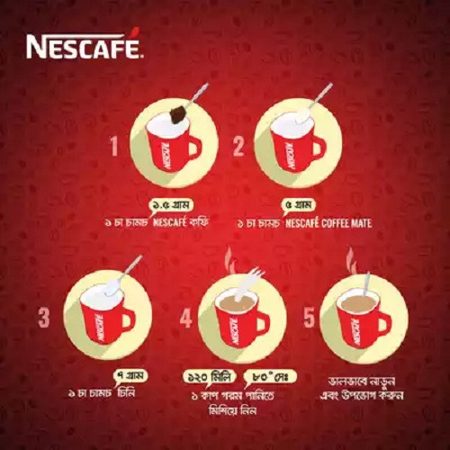 120 মিলি গরম (80 ডিগ্রি সেলসিয়াস) জলে এক চা চামচ (1.5 গ্রাম) NESCAFÉ ক্লাসিক এবং 5 গ্রাম নেসলে কফিমেট যোগ করুন। আপনার স্বাদ অনুযায়ী চিনি যোগ করুন এবং একটি নিখুঁত কাপ নেসক্যাফে পেতে ভালভাবে নাড়ুন