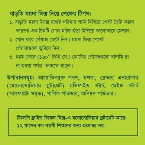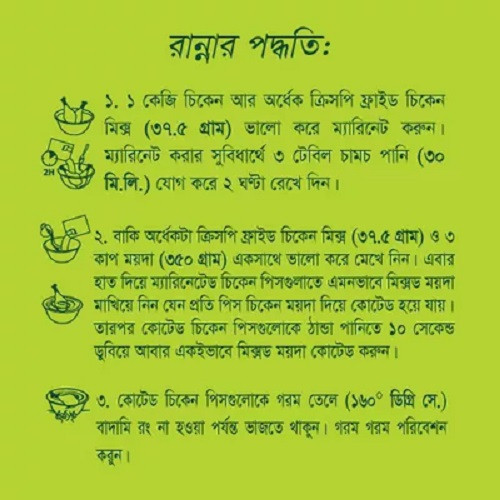 নর ক্রিস্পি ফ্রাইড চিকেন মিশ্রণের সাথে ঘরে তৈরি মুরগির জন্য পুনর্গঠিত মাংস অদলবদল করুন। আপনি অন্যান্য সুস্বাদু ভাজা স্ন্যাকস যেমন প্রস্তুত করতে এটি ব্যবহার করতে পারেন পেঁয়াজের আংটি, আলুর চপ ইত্যাদি। এই মিশ্রণটি দিয়ে বাড়িতে ভাজা মুরগির মতো রেস্তোরাঁ তৈরি করুন এবং আপনার বাচ্চাদের খাওয়ান স্বাস্থ্যকর খাবার!